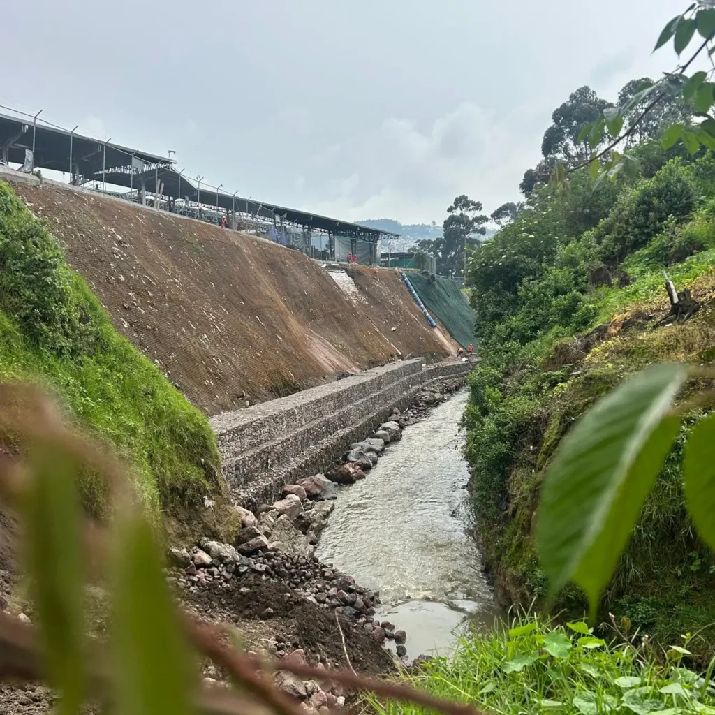 En la parte oriental del mercado, al fondo de la quebrada, se ve el movimiento constante de obreros y maquinaria trabajando para terminar esta intervención. La estructura se sostiene en cuatro capas de gaviones instaladas a lo largo del margen izquierdo, una técnica que permite contener el terreno y reducir los riesgos frente a lluvias o deslizamientos.
